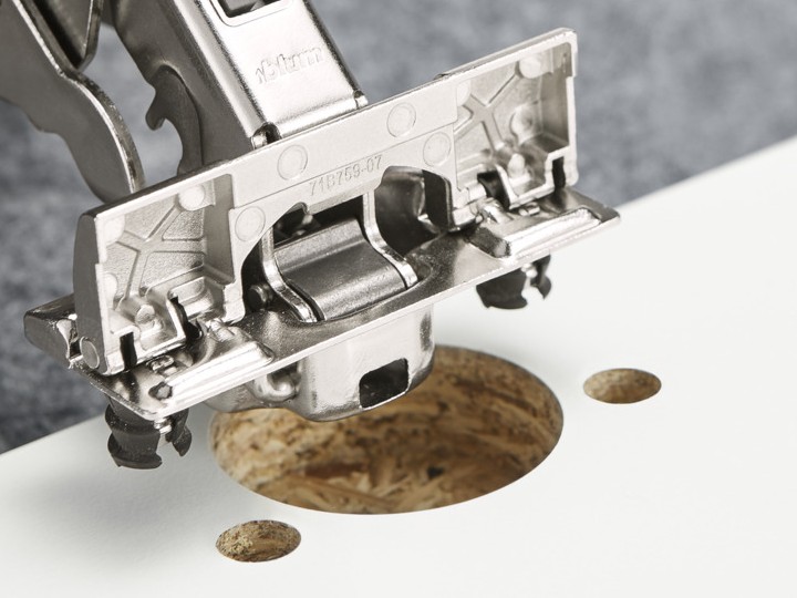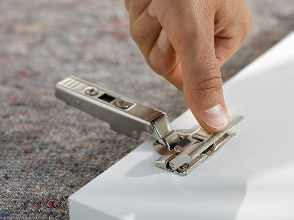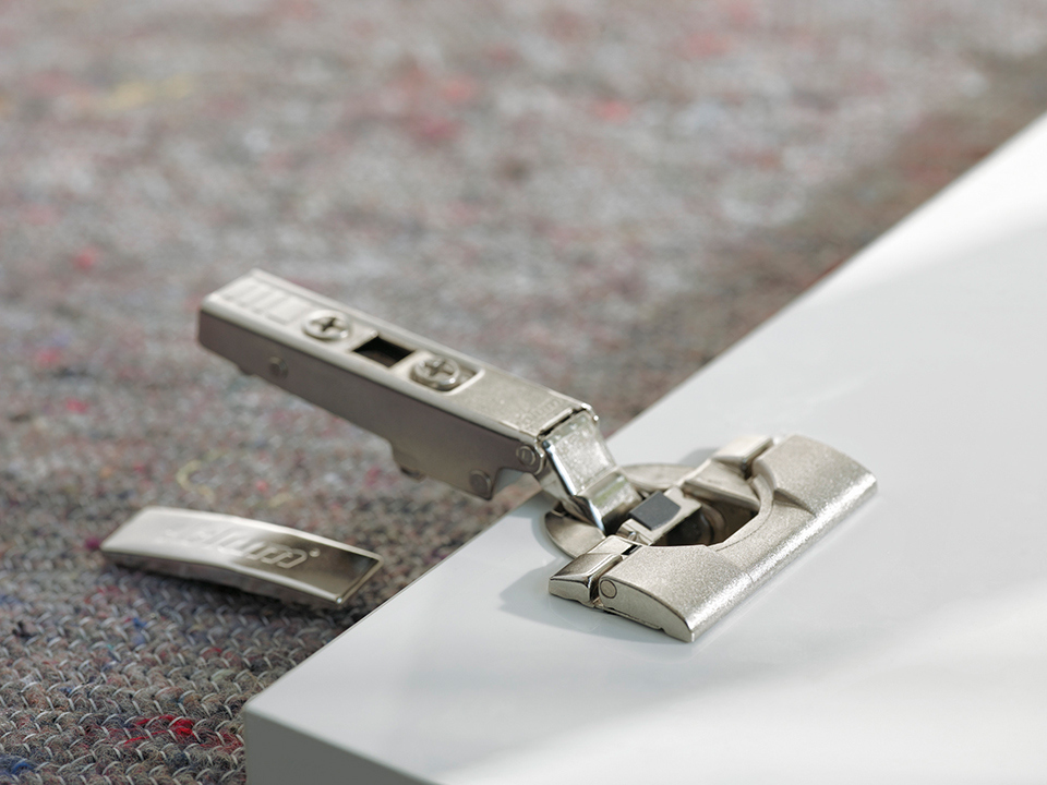 Overlay clip-on hinge with integrated Blumotion soft-close (can be deactivated), for large overlay on thick cabinet sides – overlay up to 20 mm, door thickness up to 26 mm. Opening angle 110°. Convenient overlay and depth adjustment on the hinge arm. Height adjustment on the mounting plate. Tool-free Inserta cup fixing.
