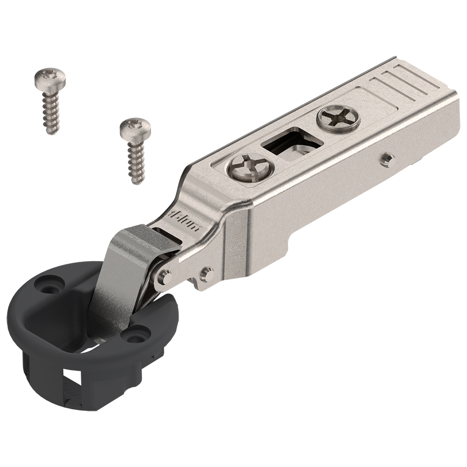 Hinge with closing spring for drilled glass doors, without soft close, opening angle 94°. Overlay as specified in the product name. Glass thickness 4.5–7.0 mm. Glass drilling diameter 26 mm (+0.2/–0.0), distance from the outer edge of the drilling to the door edge 5.5–7.0 mm.