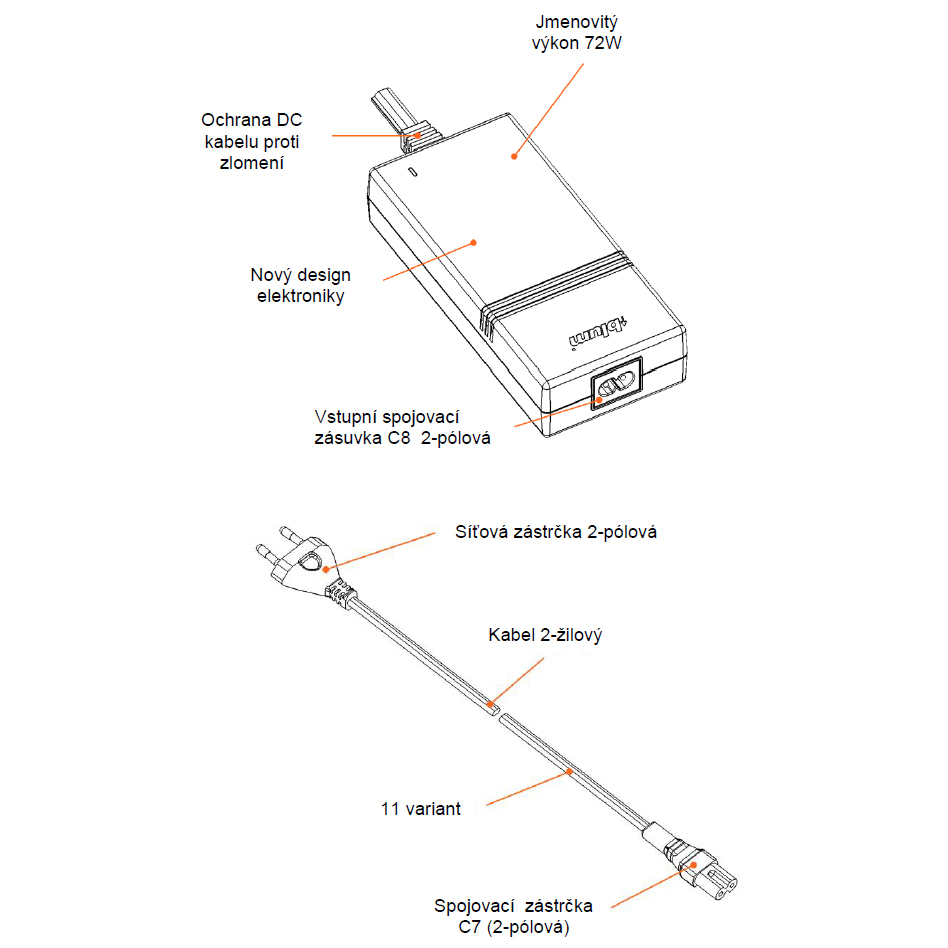 Optimized Servo-drive power supply (transformer) with increased power and reduced electromagnetic radiation (CE/UL) . The new generation of power adaptor is supplied with a detachable AC power cord (Z10M200E). The power input on the power adaptor is a two-pin C8 socket (100-240VAC / 50-60Hz), the output is a special profile Servo-drive cable 2m long with bend protection (24VDC). The 2m long 230V two-wire power cable is fitted with a EUR two-pin plug (E/F) and a C7 two-pin plug, also with bend protection.