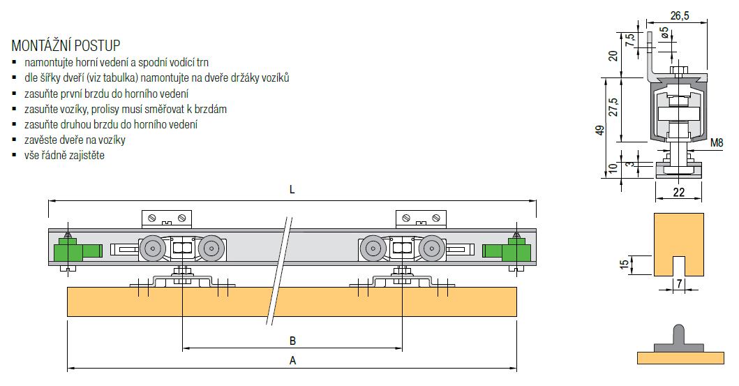 Fittings for interior sliding door (1 wing) (910 - 1100 mm) with a brake. Including top guide of length 1900 mm. Load capacity max.: 40 kg. Alternative on stock - set of fittings with soft-closing - 393305.