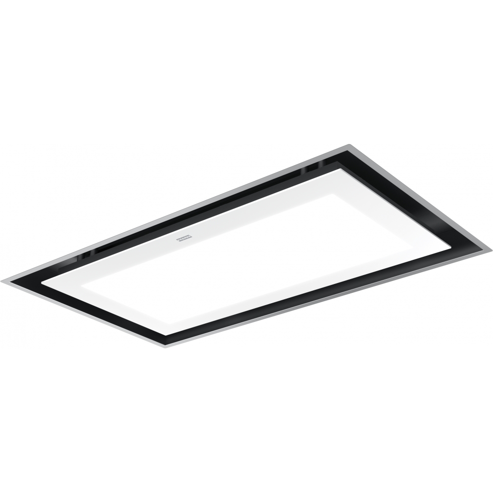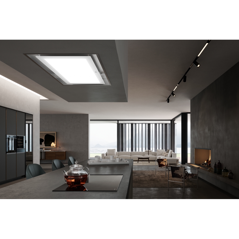 Built-in ceiling hood Mythos Full Glass. Design white glass, RAL 9010 in combination with RAL 7042, stainless steel frame. Energy class A. Sensor control. Slotted suction. 3 Levels of performance. 2 × Intensive level. Catching up. Wi-Fi, Bluetooth. Permanent ventilation function. Filter saturation indicator. Note: Price without recycling fee. 350.0679.886