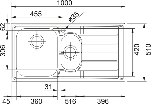 FRANKE Sink NEX 651/2P 1000 x 510mm stainless steel drain right