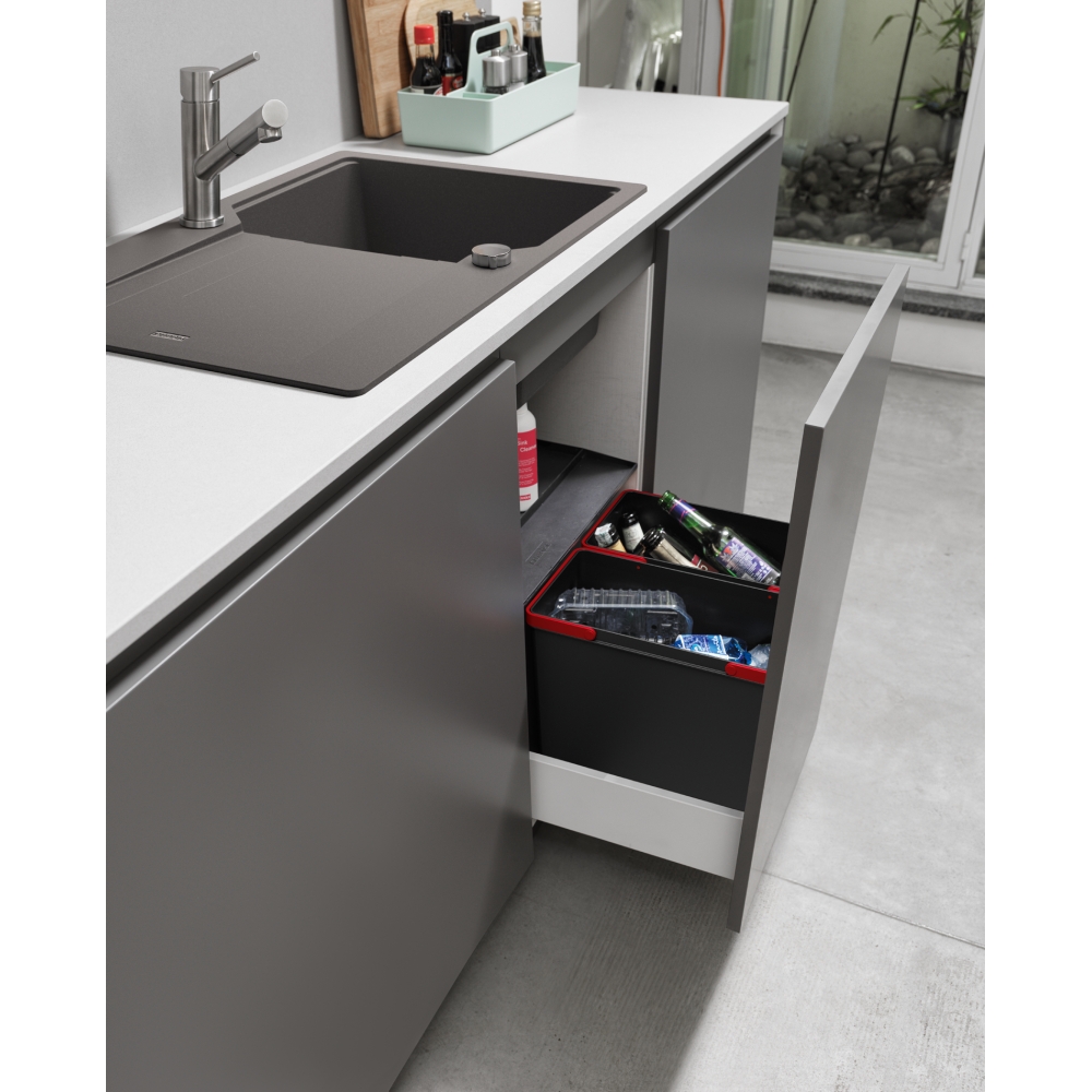 The basket is placed in a drawer with full extension, which is equipped with a longitudinal railing or a high side.