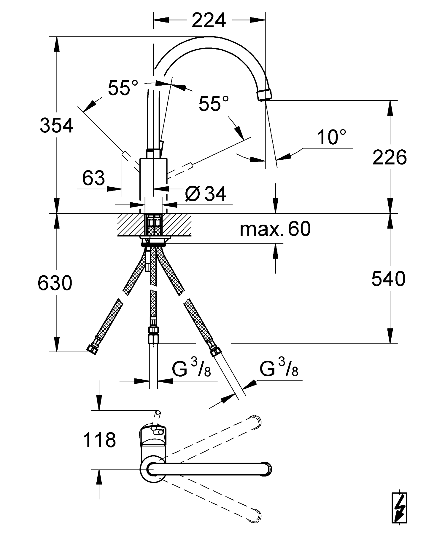 If you are looking for a kitchen faucet for use with an instant heater, this low-pressure faucet from the Concetto series is the ideal choice. It includes the required three holes for flow heaters from the factory, so hooking up the battery will be a matter of time thanks to our easy installation system. Thanks to the high outlet and the adjustable rotation range of 0°, 150° or 360°, you get more freedom of movement and flexibility when cooking and cleaning. With its minimalist look, curved spout and brilliant GROHE StarLight chrome finish, this sink faucet will be a fantastic addition to your kitchen.