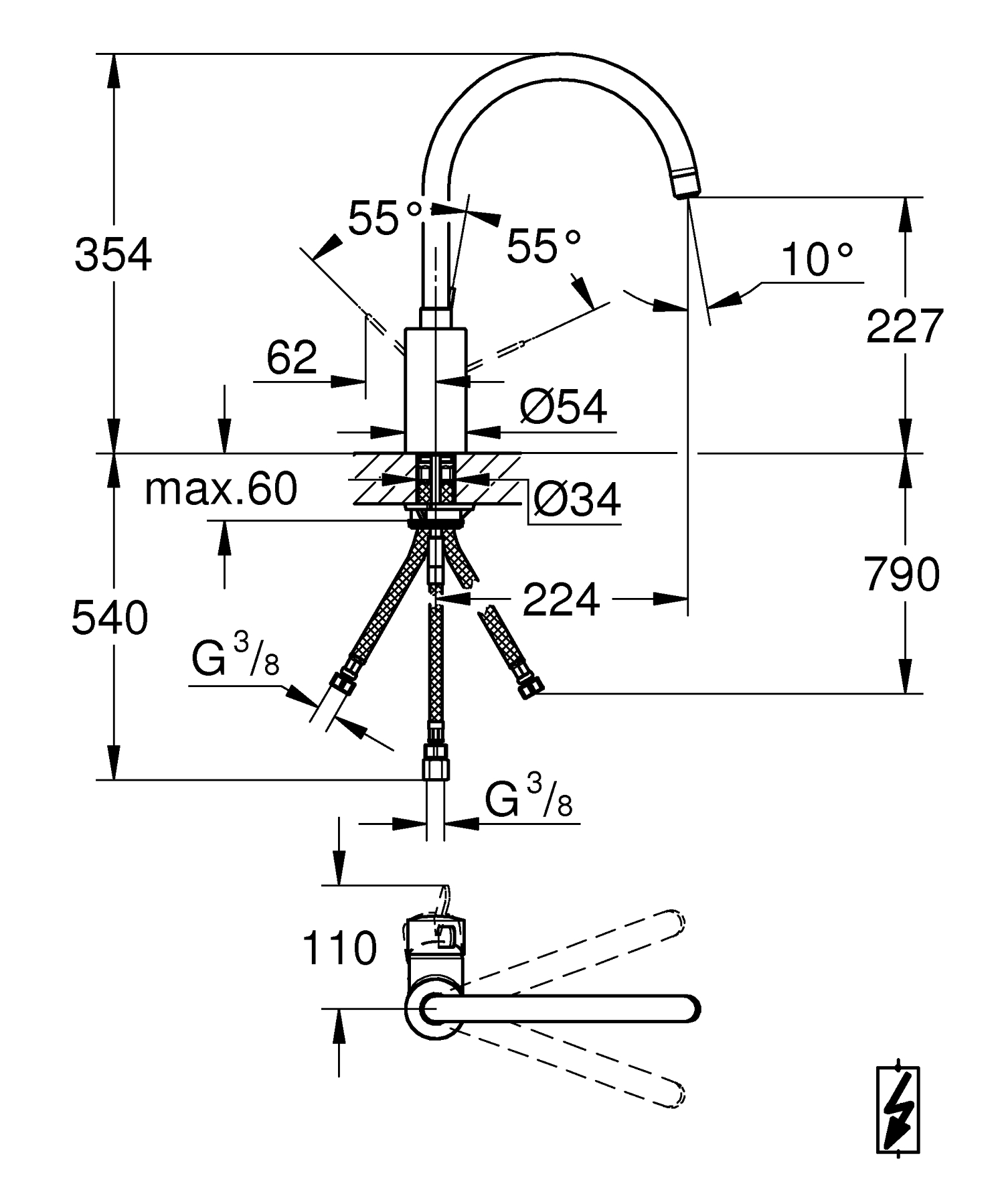 The instantaneous water heater places special demands on the kitchen faucet. Compared to a central water supply, this means that three hoses need to be connected. If you are looking for a suitable low-pressure faucet, this GROHE lever faucet will be ideal for you. And the Eurosmart Cosmopolitan kitchen faucet offers even more: the high spout makes it ideal for filling or rinsing large pots, and thanks to the attractive premium chrome finish, just a soft cloth is enough to restore its shine. Affordable and attractive: this lever faucet will become the jewel of any kitchen.