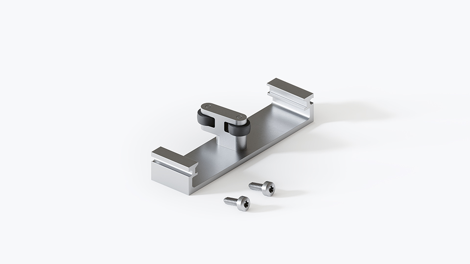 Lower connecting part 110 mm, length 26 mm, anodized aluminum. For connecting a cabinet with two sliding doors. For mounting in front of a fixed plinth.