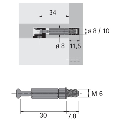 Screw-in pin for Rastex 15, thread M6 x 7.8 mm, clamping dimension 30 mm, galvanized steel, black plastic.