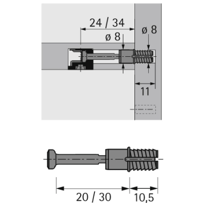 Quick mounting pin, expansion sleeve for 8 mm bore diameter. Clamping dimension 30 mm. Steel/ blue plastic.