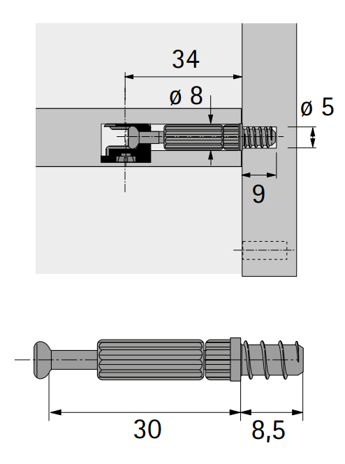 Pin for screwing Twistr/housing for Rastex 15, euro thread for drilling diameter 5 mm, clamping dimension 30 mm, thread length into body 8.5 mm, galvanized steel, black plastic.