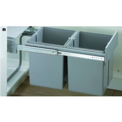 For cabinet width min. 400 mm. Mounting on the bottom of the body. System with full extension. Width 338 mm, depth 485 mm, height 385 mm. The set includes: 2 containers of 20 L, complete fittings with full extension and body lid. Container + lid: gray plastic.