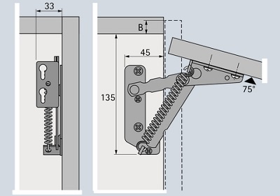 Set. Spring force 90 N. Opening angle 75°. Rational installation in pre-drilled holes. Maximum door weight 2 kg. Nickel-plated steel. The set includes: right and left hinged fittings.