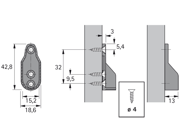 For screwing with 3 screw holes, hole spacing 32 mm, steel - white finish.