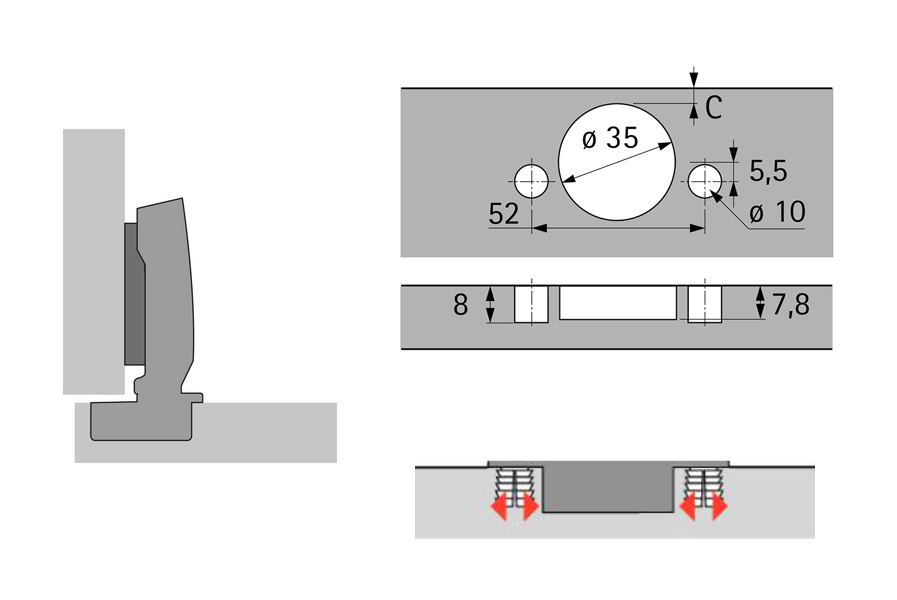 Suspension with clip technology and integrated damping. For door thickness 10 - 19 mm. Bowl diameter 35 mm. Bowl depth 7.8 mm. Integrated loading adjustment + 2 mm, - 2 mm. Integrated depth adjustment + 3 mm, - 2 mm. Height adjustment with mounting pad. Hanger arm material: nickel-plated steel. Hinge bowl material: nickel-plated steel. Attention: The fastening of the hinge to the door must be chosen depending on the material and quality and ensured by means of a suitable test. Recommended washers: D 1.5 for screw 106403 D 1.5 for euro 119240 Bowl cover no. 105408 and hanger cover no. 105425 are ordered separately.