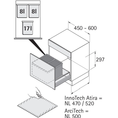 To be placed in a tall InnoTech drawer with a length of 470 or 520 mm. for cabinet width 450 - 600 mm. Volume 33 liters. Built-in height 297 mm. The set includes: 3 pcs container with lid 17+ 8 + 8 liters, 1 pc inserted mat. The ImnnoTech socket is ordered separately.