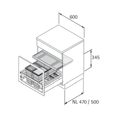 Sorter for use in ArciTech or InnoTech Atira drawers. The built-in frame is placed on the railing and fixed to the front and bottom of the drawer. The partially extendable lid offers additional storage space. Built-in frame, pull-out lid, container and lid: gray plastic. Built-in height 345mm from the top edge of the bottom of the drawer.