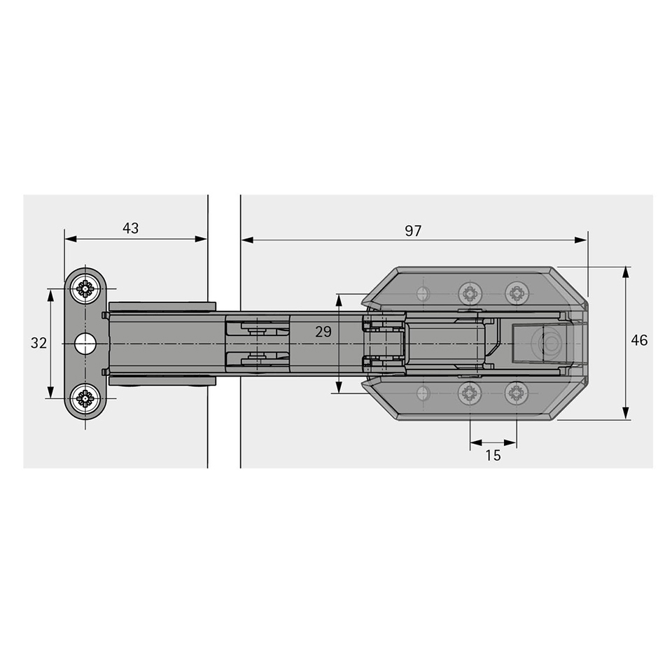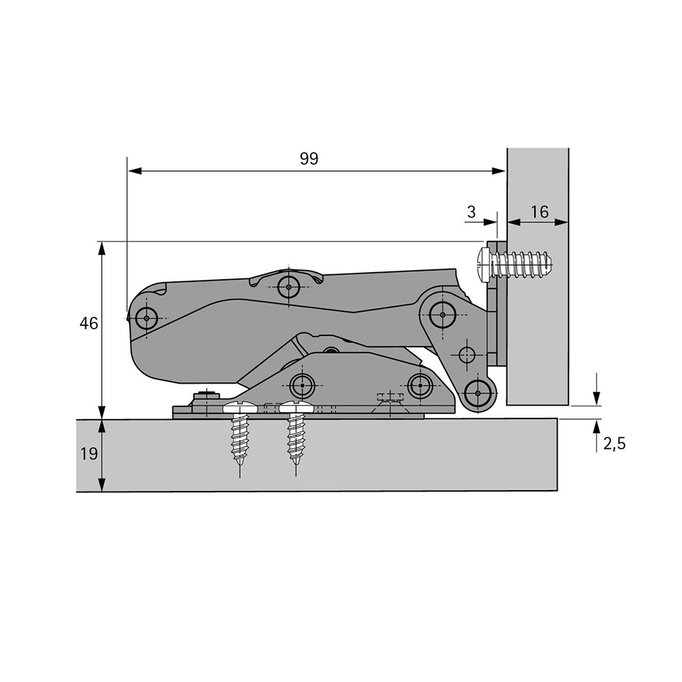 Additional hinge to be screwed on, for the overhanging part of the door above the built-in refrigerator. Quality in accordance with EN 15570, level 3. For bodies with a side thickness of 19 or 16 mm. Built-in depth 41.5 mm. Material: steel, nickel-plated. The set includes: Hinge, template, distance piece for the side of the corpus st. 16 mm, spacers, white cover, fixing screws, assembly instructions.