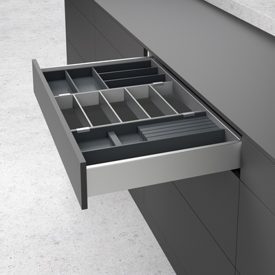 OrgaTray 630 distributor for the AvanTech You and ArciTech system. Color silver. For drawer depth 450 mm. The size of the distributor w=271, h=43, h=423 mm.