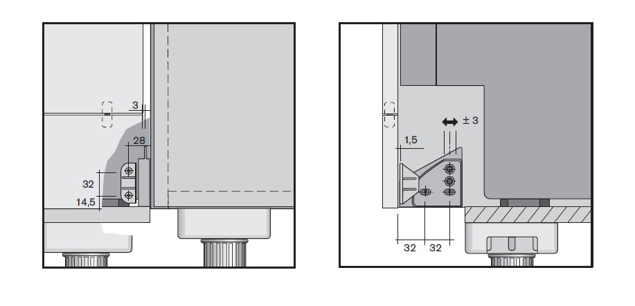 Guide for the lower hinged part of the front of a built-in dishwasher. Use with elevated kitchen units. It prevents the dishwasher door from colliding with the kitchen plinth. Use in planning in the so-called 6 grid (see figure 6 grid). The line is mounted on the adjacent body. Only 1 piece in the package, 2 pieces must be bought for one door. It is also necessary to add 2 pcs of "edge-edge" hinges, see the related assortment.