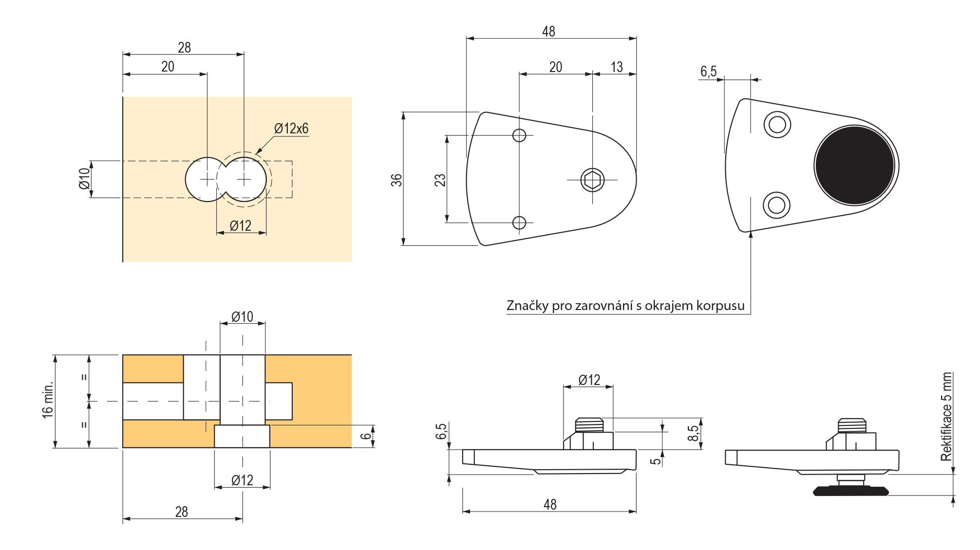 Rectification foot LH7.28. Very small size with high load capacity and rectification of +5mm to compensate for unevenness. Metal body and plastic glider. Load capacity up to 150 kg per leg