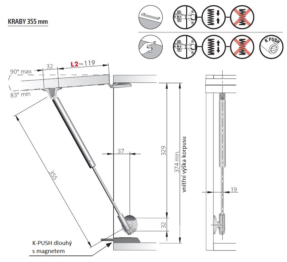 If Gas Lift-Up Kraby, For Lift-Up, Adjustable, 355Mm/60N