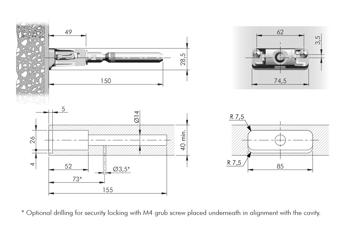 Carrying capacity of a pair at a shelf depth of 400mm = 40kg. Allows for three-way adjustment - vertical, lateral and tilt adjustment. Installation in the wall using 2 dowels 8 mm diameter and 2 screws, drilling distance 62 mm. Mandrel diameter 14 mm, mandrel length 94 mm, total length 150 mm. Designed for a shelf with a minimum thickness of 40 mm and a depth of 200 mm. VERY IMPORTANT. Brackets must always be mounted with the inscription "TOP-ALTO" facing up. For easier assembly, you can order a complete set of drill fixtures - 405882 IF-complete set of drill fixtures for Triade Mini, Triade and Triade Maxi.
