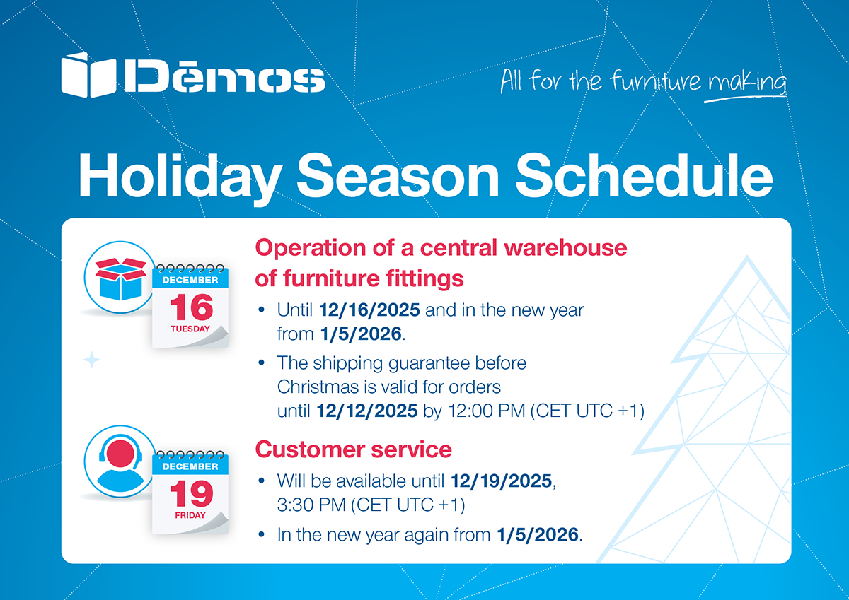 The central warehouse for furniture fittings in Ostrava will ship packages until December 16, 2025, and will reopen on Monday, January 5, 2026. Customer service will be available until December 22, 3:30 PM, and will resume on January 2, 2026.