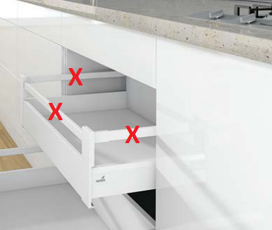 Fittings for ArciTech internal drawer in white, drawer depth 450mm, side height 94mm, total height 186mm, drawer load capacity 40kg, SiSy damping. The set includes 1 pair of side panels, 2 pcs of front brackets 186 mm (needs to be supplemented with a front plate order no. 301001, height 70 mm, length 2000 mm, shortening = body width-2xEB-62, also a front railing order no. 269640, length 2000 mm, shortening = internal width of the body-2xEB-66.5), 2 pcs of Hettich caps, 2 pcs of back holders 186 mm. For handle-free P2OS opening, it is necessary to add the correct P2O module, if the drawer is wider than 600mm, it is necessary to add a synchronization rod (318279) shortening = body thickness-2xEB-207.