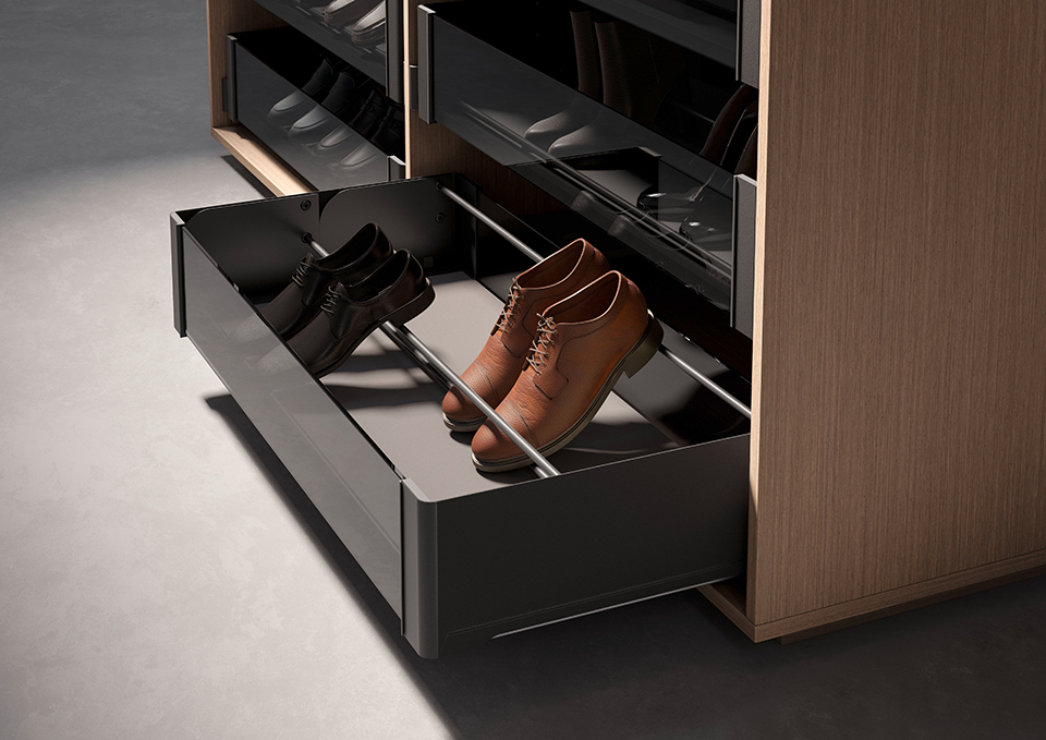 Komplet kování pro sestavení zásuvky Conero v černé barvě, včetně výsuvů a čelní i zadní výplně. Součástí je také vklad na boty. Komplet lze doplnit o distanční podložku, nebo dekorační podložku ke krácení. Dno je nutno vyrobit.