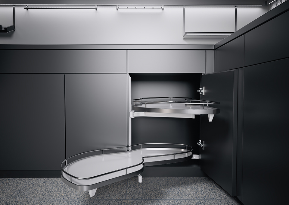 Thanks to the specially shaped geometry of the shelves, it increases the actual storage area by up to 70%. A clear advantage over comparable pull-out cabinets. If LeMans II is equipped with a damping mechanism, which is available as an option, the movement of the shelves is almost noiseless. This optimum comfort can be retrofitted quickly and easily at any time.