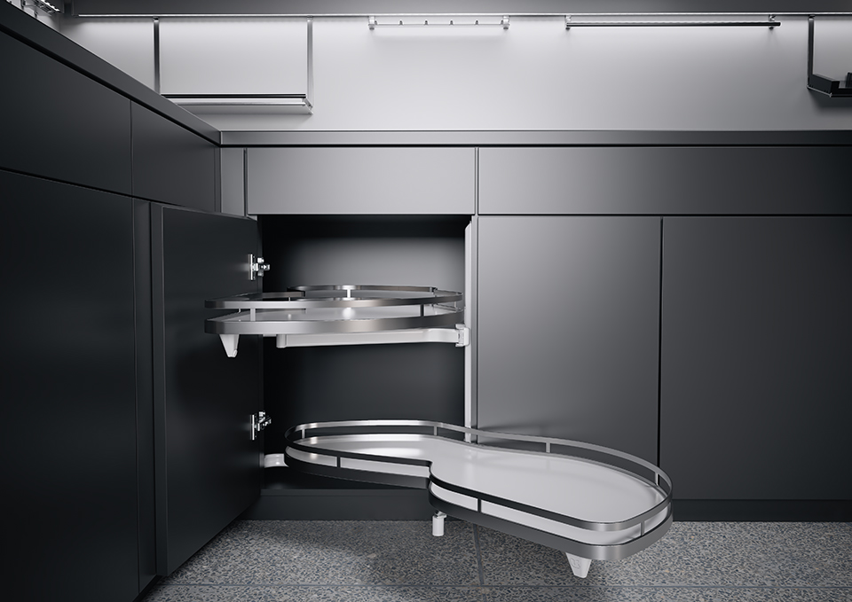 Thanks to the specially shaped geometry of the shelves, it increases the actual storage area by up to 70%. A clear advantage over comparable pull-out cabinets. If LeMans II is equipped with a damping mechanism, which is available as an option, the movement of the shelves is almost noiseless. This optimum comfort can be retrofitted quickly and easily at any time.