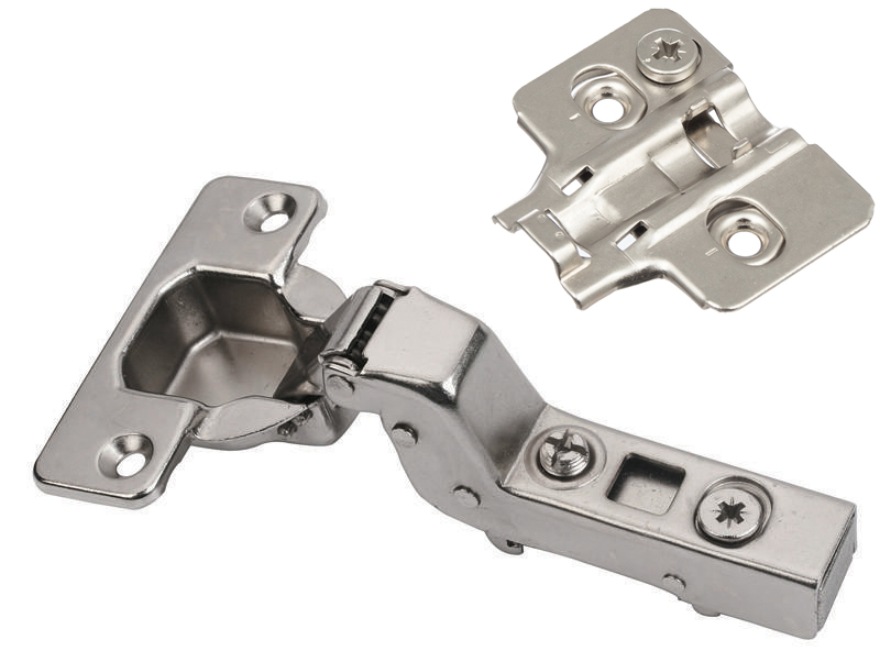 Complete S5 hinge set with mounting plate. Hinge with closing spring (two-way construction), 110° opening angle, screw-on cup mounting and eccentric depth adjustment.