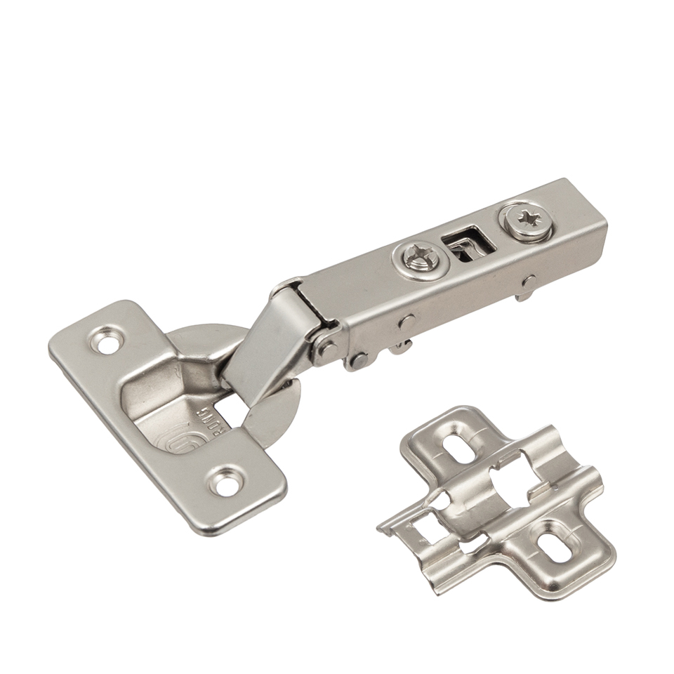 Complete S5 hinge set with mounting plate. Hinge with closing spring (two-way construction), 110° opening angle, screw-on cup mounting and eccentric depth adjustment.