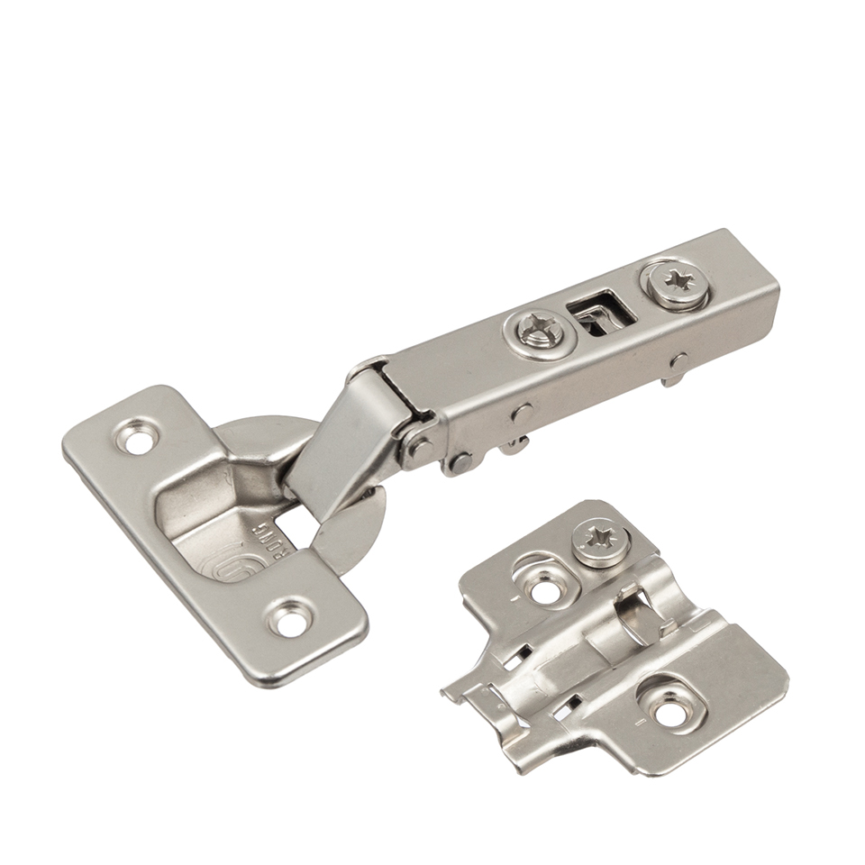 Complete S5 hinge set with mounting plate. Hinge with closing spring (two-way construction), 110° opening angle, screw-on cup mounting and eccentric depth adjustment.