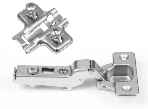 Complete S5 hinge set with mounting plate. Hinge with closing spring (two-way construction), 110° opening angle, screw-on cup mounting and eccentric depth adjustment.