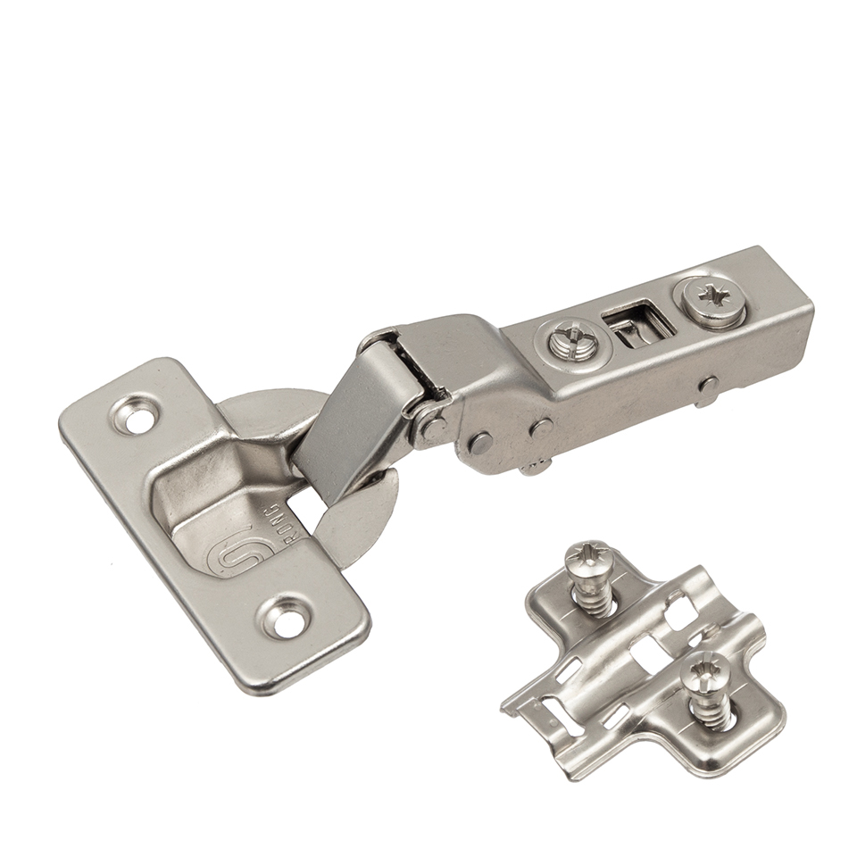 Complete S5 hinge set with mounting plate. Hinge with closing spring (two-way construction), 110° opening angle, screw-on cup mounting and eccentric depth adjustment.