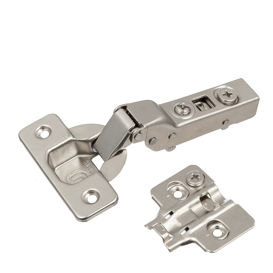 Complete S5 hinge set with mounting plate. Hinge with closing spring (two-way construction), 110° opening angle, screw-on cup mounting and eccentric depth adjustment.