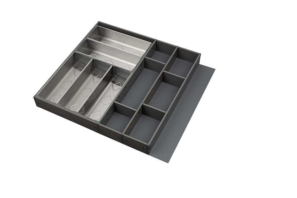 The set includes: .402931 StrongMax cutlery tray set H=500, W=276mm grey, including 3+2 cups. 335013 StrongMax 89/500 mm grey (anthracite) . 399208 StrongMax cutlery tray H=500 side panels with perforations grey. 399205 StrongMax cutlery tray front/rear panel 88mm grey . 399209 StrongMax cutlery tray inner partition 88mm grey . 354056 Ago-Kristall 60 (522x474mm) anti-slip mat black .