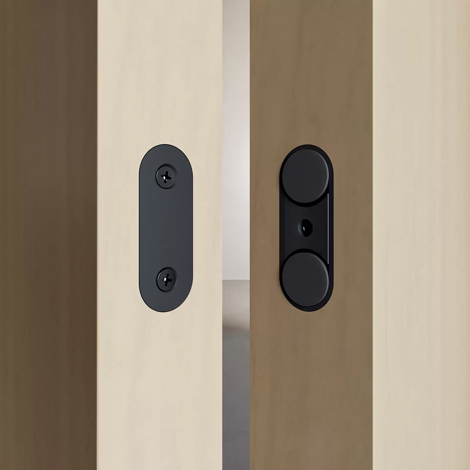 Sada kování pro dvě křídla s bezfalcovými závěsy (4 ks) a magnetickou aretací (3 ks). Verze bez spodního vedení. Pro výšku dveří 2400 - 3000mm, nosnost 80kg/1 křídlo. Tloušťka materiálu 40 - 45mm. Barva černá (práškově lakovaná).