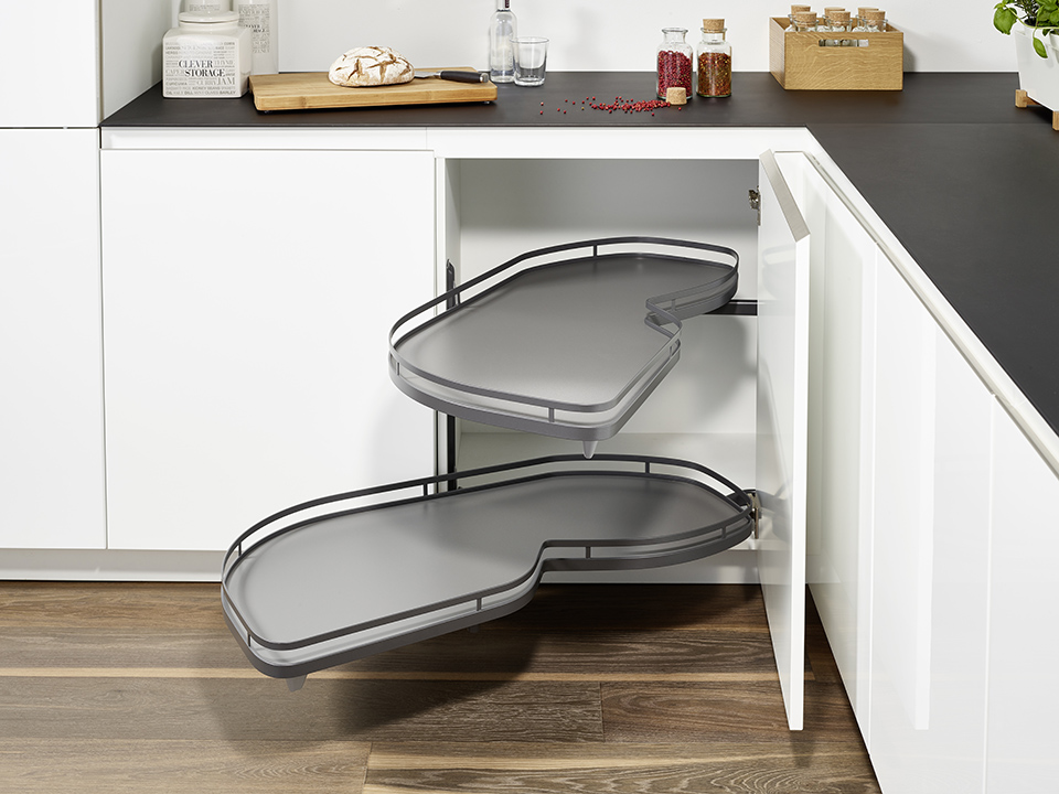 Set of two Arena STYLE shelves (flat wire) for solving the lower corner cabinet (so-called blind corner), anthracite LeMans II To LeMans II it is possible to add an external damper which tightens the shelf, dampens it and prevents shock when closed. Bottom with Anti-slip surface treatment. For 900mm body. Mounting the damper on the outer arm. Internal dimensions of the body: width: 860, depth 500, height: 600-750 or 720-900mm. Door size 411-418mm. Mounting rod + side mounting - 315036 (600-750mm). Shelf load 25kg. External damper for right variant - 315039.