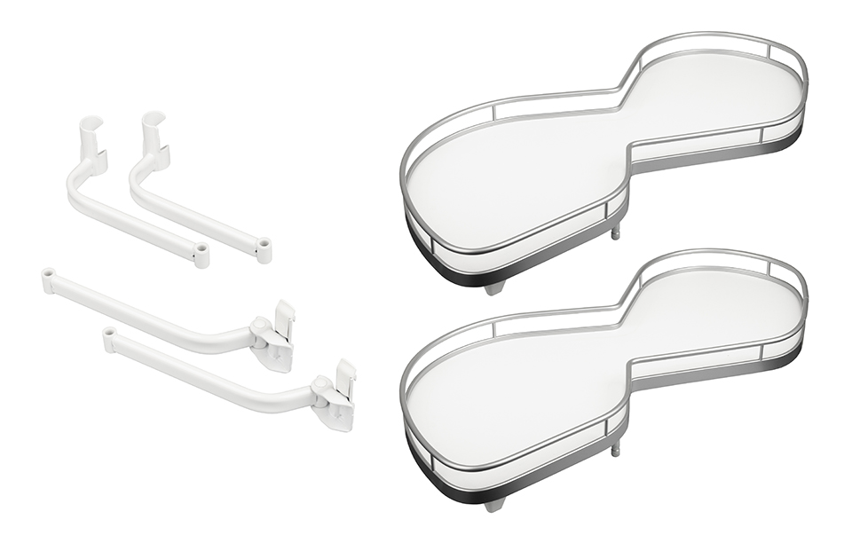 Set of two Arena CLASSIC shelves for the solution of the lower corner cabinet (so-called blind corner) LeMans II. Bottom with Anti-slip surface treatment. It is possible to add an external damper to the LeMans II which tightens the shelf, dampens it when closed and prevents shock. For an 800 mm body. Mounting the damper on the outer arm. Internal dimensions of the body: width: 764, depth 500, height: 600-750mm or 720-900mm. Minimum door size 361-368mm. Mounting rod + mounting on the side of the body - 160132, external damper for the left variant - 318464. Shelf load 25kg.