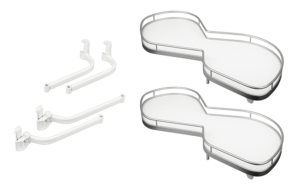 Set of two Arena CLASSIC SIVER/ICEWHITE shelves for the solution of the lower corner cabinet (so-called blind corner) LeMans II. Bottom with Anti-slip surface treatment. It is possible to add an external damper to the LeMans II which tightens the shelf, dampens it when closed and prevents shock. For a body 1000mm and a hole 561-568mm. Mounting the damper on the outer arm. Internal dimensions of the body: width: 960, depth 500, height: 600-750mm or 720-900mm. Minimum door size 561-568mm. Mounting rod + mounting on the side of the body - 160132, external damper for the right variant - 318463. Shelf load 25kg.