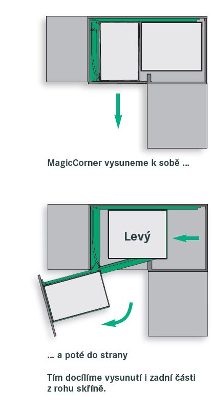 Mechanismus pro řešení spodní rohové skříňky (tzv.slepého rohu). Levá varianta = mechanismus se otvírá doleva. Pro korpus o šířce 900-1000mm. Rozměry korpusu: šířka:860-971, hloubka: 485, výška: 525mm. Dvířka min. 450mm. Nosnost polic: přední 14kg, zadní 18kg. Sady košů je nutno objednat zvlášť.