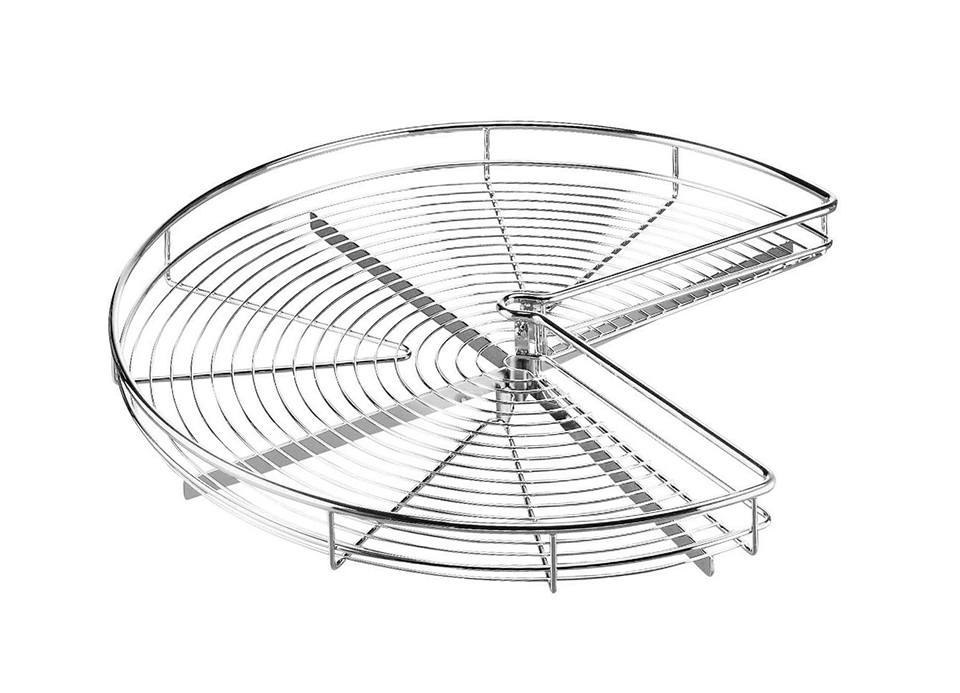 Designed for the lower corner body with a width of 900mm (3/4). Set of two shelves - all wire gray, bottom with Anti-slip, non-slip surface finish. Designed for cabinets with classically opening doors on hinges. Internal body dimensions: width - greater than or equal to 840mm, depth - greater than or equal to 840mm, height 655-745mm. Shelf diameter: 820mm.