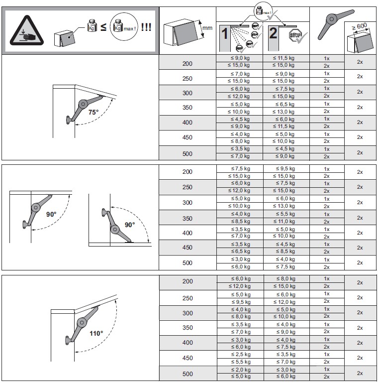 Adjustable DUO flap. Opening angle 75, 90 and 110 °. Possible for upper and lower door tilting (by turning the arms). It is necessary to order the mounting of the door and the body (135019 + 135045 or 135024 for aluminum frames)