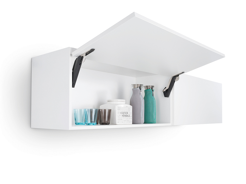 Complete set for handle-free opening (PTO - Push To Open) for upper cabinets without using hinges with minimalist fitting dimensions. Headboard height 200-650mm, width up to 1800mm. Integrated opening angle limiter 107°=>90°.