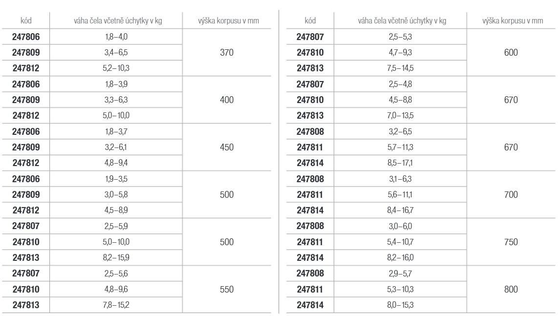Usage: height up to 370mm and weight 1.8-4kg. Height up to 400mm and weight 1.8-3.9kg. Height up to 450mm and weight 1.8-3.7kg. Height up to 500mm and weight 1.8-3.5kg. Full (automatic) handleless opening is possible with the eTouch kit.