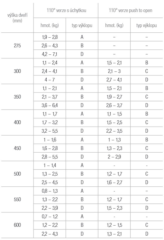 Type and color indicated in the product name. Opening angle 75, 90 and 110°.