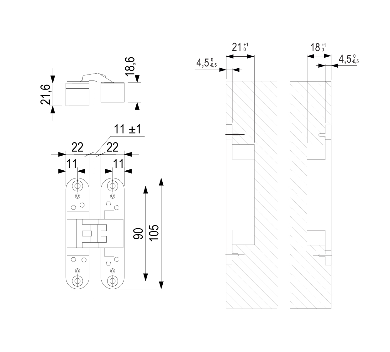 Hinge for non-rebated doors with 3D adjustment: Vertical Adjustment: +/- 3mm, Depth Adjustment: +/- 1,5mm. Maximum load capacity: 30 kg for 2 hinges, 45 kg for 3 hinges. The minimum door thickness is 30 mm. Optional accessories are brackets for cladding or steel door frames. Mounting template 256045 (frame) + 268077 (inserts)