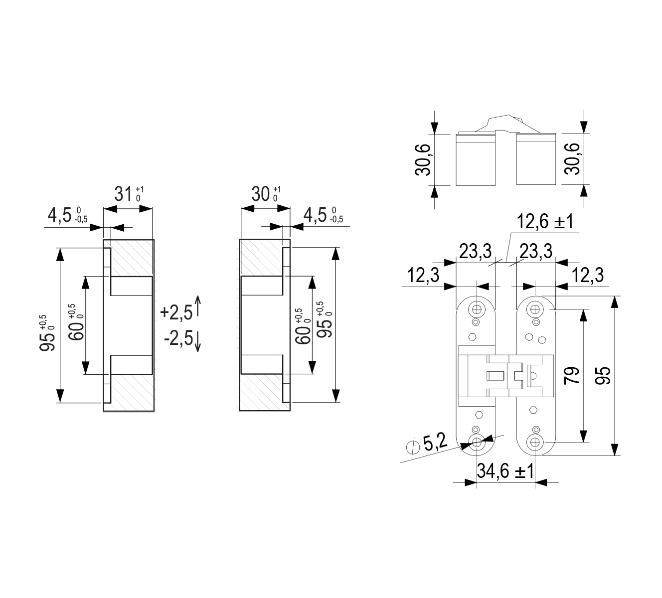 Hinge for rebateless doors with 3D adjustment. height +/- 2.5mm, anteroposterior + 3 / -2mm, laterally +/- 1mm. The maximum load capacity of the door is 45 kg for 2 pieces of hinges (60 kg for 3 pieces). Fireproof hinge design according to ANSI / UL 10C standard. Mounting template 256045 (frame) + 256048 (inserts)