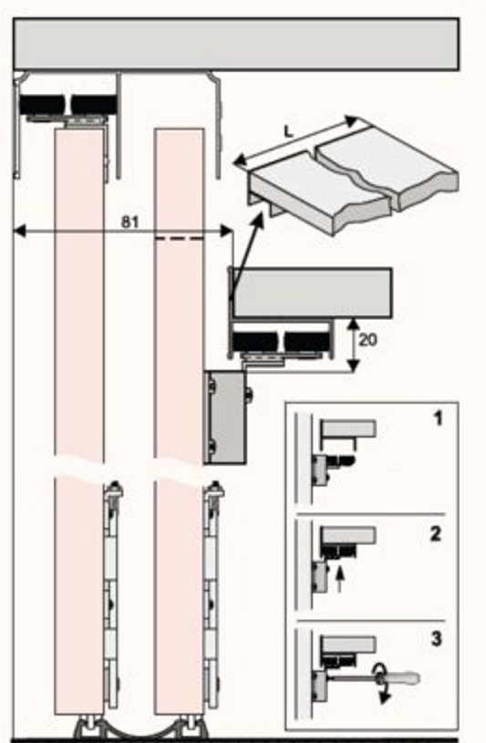 Molding for making built-in cabinets with slanted doors. It is installed on a shelf and serves as an auxiliary guide. It is necessary to purchase trolleys 98078 (intended for Universal mounting profile - 18mm thick laminate). The cabinet must have at least 3 wings! A set of trolleys and connecting elements for systems with laminate thickness is also available. 10 mm/ glass set Everest Fox - code 181590.